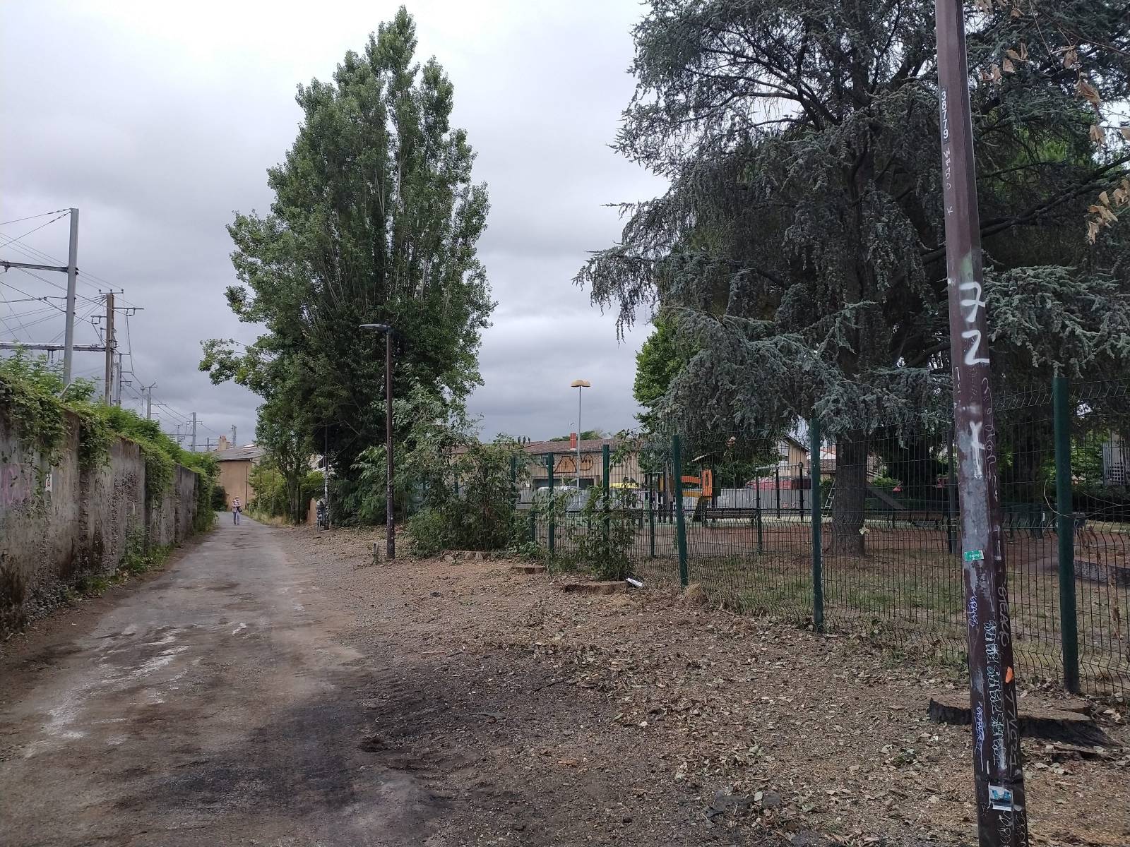 Tous d’abord l’étroitesse de la ruelle et la présence de mobilier urbain (clôture, lampadaire, aire de jeu situé dans le parc sous les arbres) ne nous permettait pas d’abattre ces arbres depuis le sol. Il nous a fallu utiliser des systèmes de rétention au moyens de cordes et de poulies afin de contrôler la chute des branches. L’autre principale contrainte était la présence de plusieurs voies SNCF situées à moins d’une dizaine de mètre du pieds des arbres.