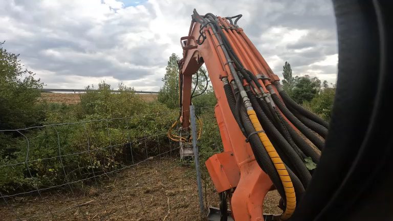 Pour faire ce chantier, nous avons utilisé une pelle mécanique équipé d’un broyeur forestier et un robot de pente pour rouvrir un passage le long de la clôture.